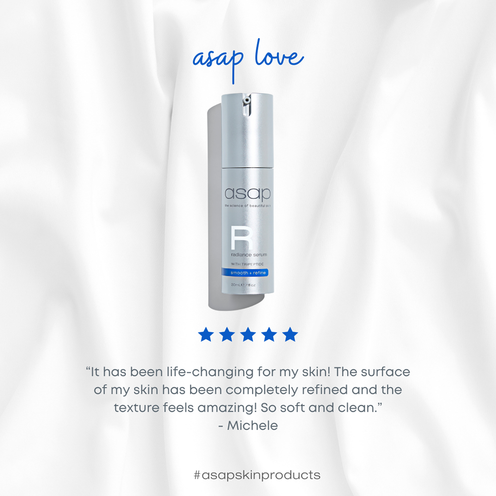 A new generation of brightening substances derived from botanical extracts —asap radiance serum delivers powerful brightening effects and a reduction in the appearance of hyperpigmentation. Combines with an anti-ageing Biomimetic Tripeptide, a powerful AHA/BHA blend, and a skin-brightening botanical extract to increase cell renewal, rejuvenate skin and assist in the reduction of pigmentation, sun damage, and acne.