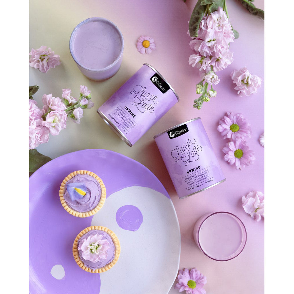 Lunar Latte is a blissful blend of vibrant purple carrot, ashwagandha, traditional Chinese adaptogens and organic floral botanicals lavender, chamomile and passionflower to make a Moon Milk potion to help relax before bed.