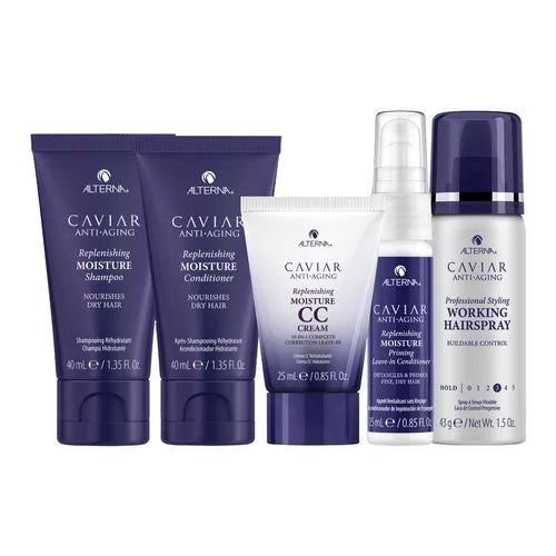 Everything you need to care for and style dry hair. ALTERNA HAIR Replenishing Moisture Ritual- Deluxe Travel Kit comes complete with shampoo, conditioner, hair primer and hairspray, plus the brand’s signature leave-in CC cream. All products are enriched with caviar and formulated to moisturise and restore dry hair.