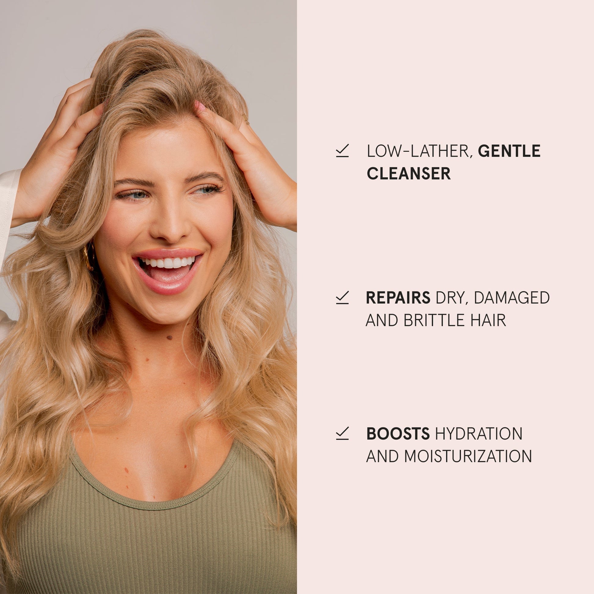 Strengthening vegan shampoo with hydrating and smoothing benefits developed for dry, damaged and brittle hair.