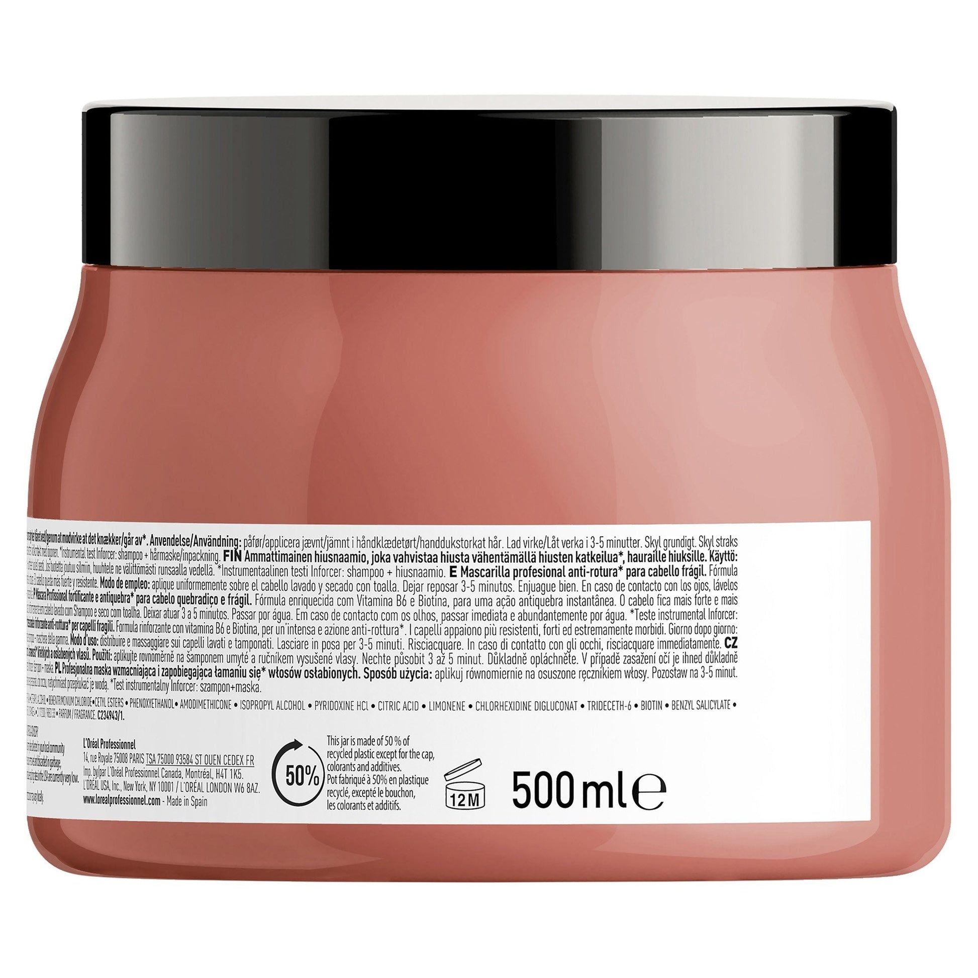 L'Oréal Professionnel's Inforcer Mask deeply replenishes and transforms fragile and damaged hair. Reinforcing, indulgent, creamy formula for normal to fragile hair infused with vitamin B6 and Biotin, for instant reduction of breakage and intense conditioning. A technology specially designed to tackle breakage and split ends. Enriched with strengthening properties of Biotin and Vitamin B6, the rich mask gently restores hair density and resilience. With continued use the Inforcer mask helps your hair to become more resistant and stronger. The reinforcing mask is recommended for: Fragile and breaking hair, especially long hair. For best results, use in conjunction with Serie Expert Inforcer Shampoo.