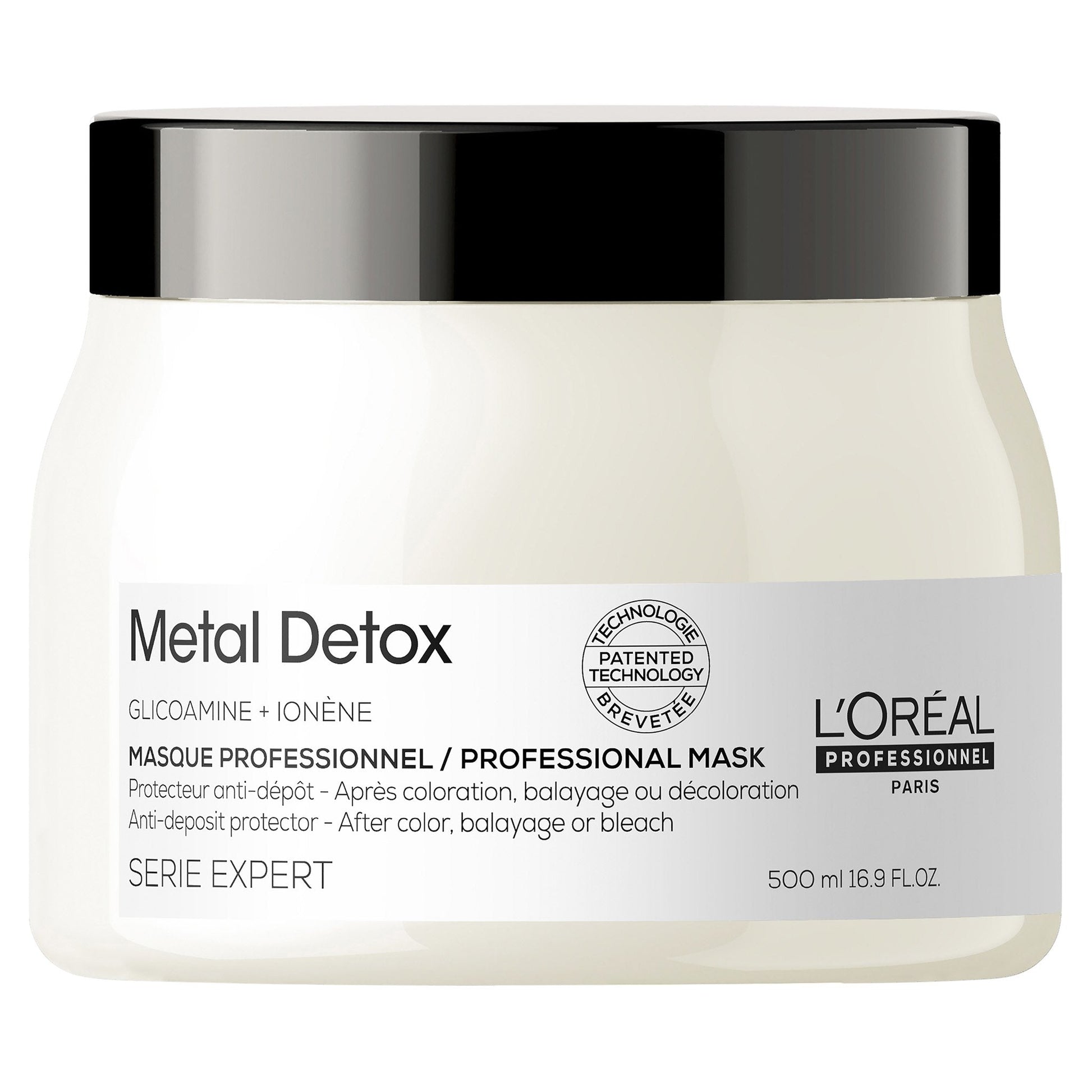 Metal inside the fiber creates both a risk of breakage and negatively impacts color results during colour, balayage and lightening services. The level of metal in hair varies, depending on hair porosity and on the water quality where we live. The L'Oréal Professionnel Metal Detox anti-deposit protector mask protects the fiber from particle deposits after any color, balayage or lightening service. It maintains color vibrancy with insense shine. Hair is instanly smoother, softer & more nourished. This internationally patented technology is enriched with Glicoamine a molecule small enough to penetrate and neutralise metal inside the fiber. For optimal results, use after your Metal Detox in-salon service to prevent new metal deposits.