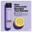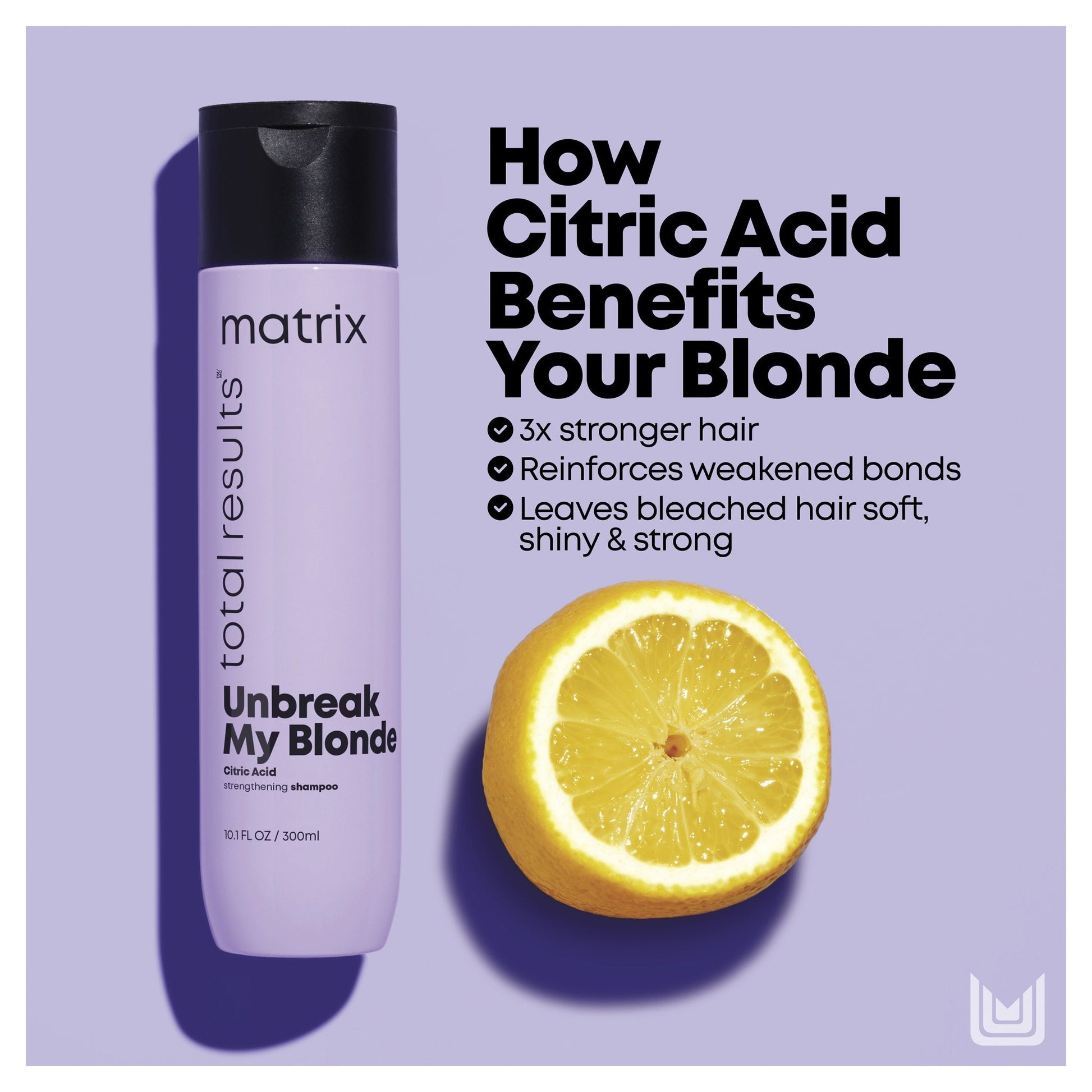 Matrix Total Results Unbreak My Blonde Shampoo is infused with citric acid to gently cleanse sensitive hair. Revives damaged and over-processed hair, leaving hair soft, shiny, and 3x stronger!