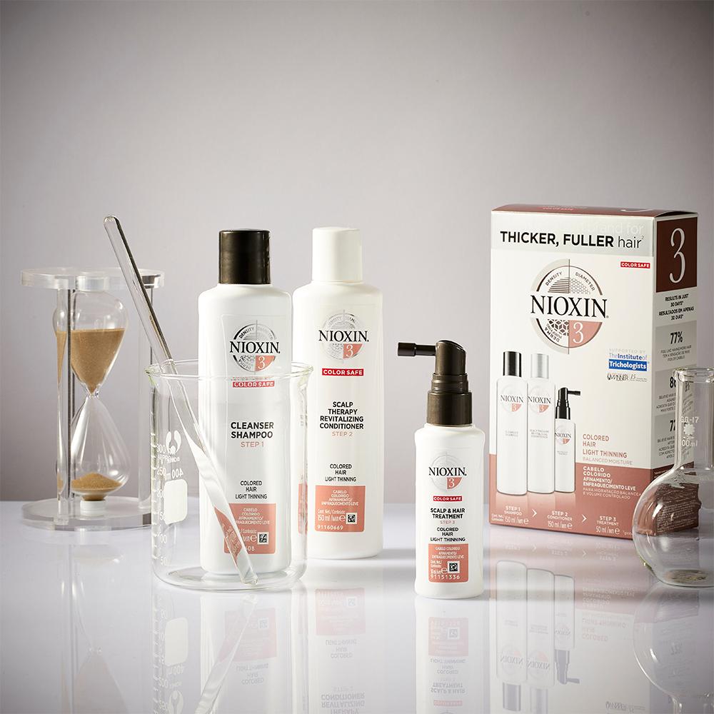 Nioxin hair care system 3 kit for color treated hair with light thinning amplifies hair structure and protects against hair breakage. This unique set of three professional hair products, based on an advanced skin care approach, is specially formulated as a hair thickening treatment, delivering fuller-looking hair and color protection.