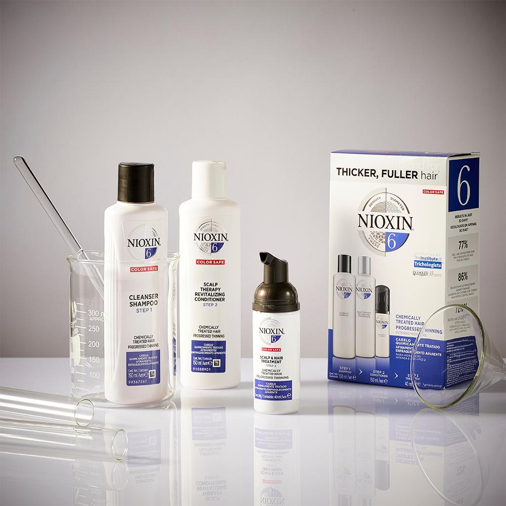 Nioxin hair care system 6 kit for chemically treated hair, such as bleached, straightened or relaxed with progressed thinning amplifies hair structure and protects against hair breakage. This unique set of three professional hair products, based on an advanced skin care approach, is specially formulated as a hair thickening treatment, delivering smoothness and hydrated hair.