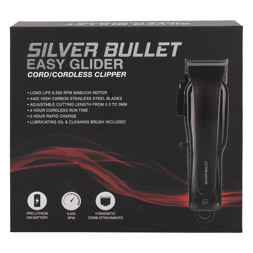 Get unbeatable precision with the high-performance Silver Bullet Easy Glider Cordless Hair Clipper. Featuring self-sharpening, solid stainless steel blades, the secret is all in the motor. The heavy-duty motor provides unbeatable professional power with durability and reliability. This clipper has the power you demand and more! Silver Bullet. Closer. Faster. Better.