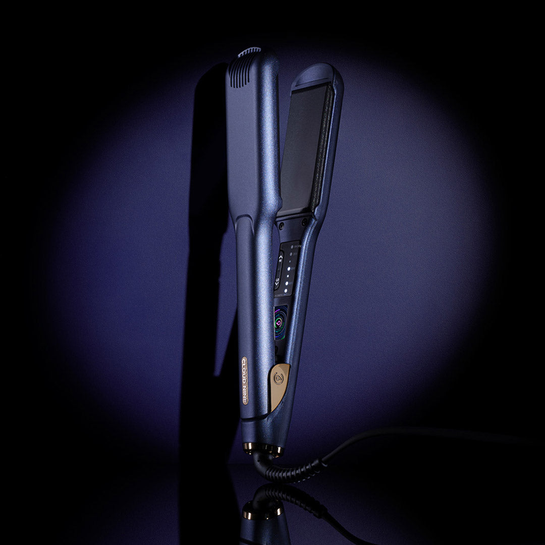 CLOUD NINE The Wide Iron Midnight features a Variable Temperature Control ranging from 100°C to 200°C across seven settings. Plates infused with our signature healing minerals Sericite and Tourmaline to seal the hair’s cuticle and lock in moisture. Floating plates cushion the impact, minimising drag and friction to reduce split ends and breakage. Automatic switch off after 30 minutes.