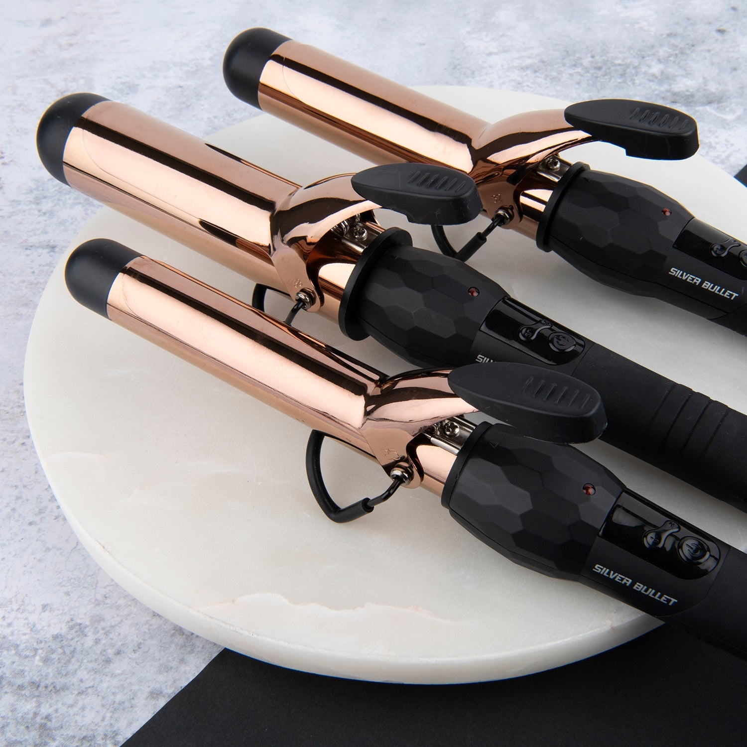 Welcome the Silver Bullet Fastlane Titanium Rose Gold Curling Irons, a set of tools poised to help you create covetable curls, while also having a luxurious design in the never-ending trending hue of the moment – rose gold. The technology draws on Silver Bullet’s famous fast styling prowess, for efficient and impressive curling. Hotter. Faster. Better Curls and Waves, that’s Silver Bullet!